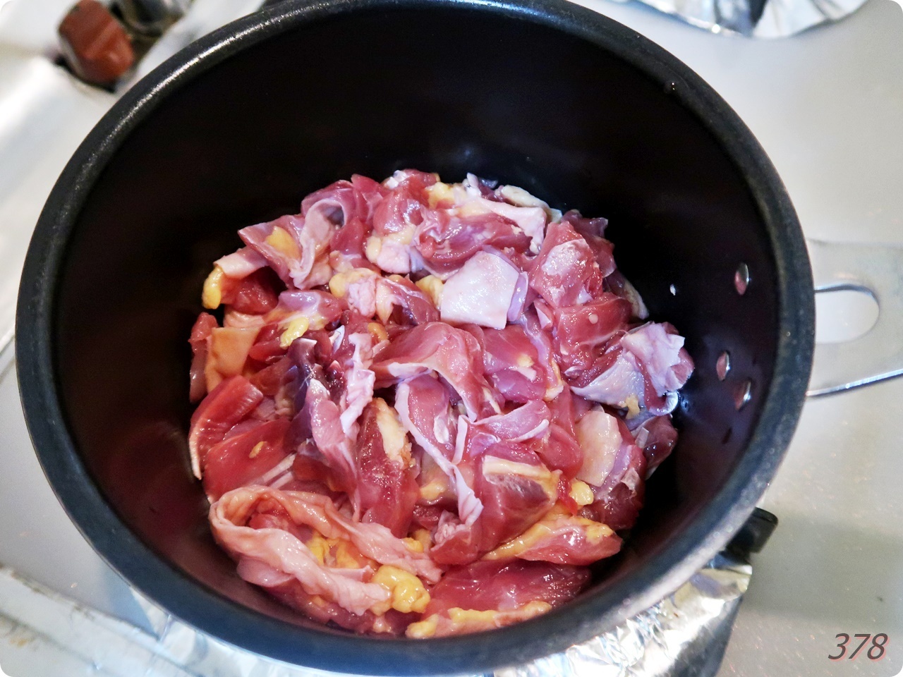 1. しねにぐをひと口大に切って、皮が鍋底につくように並べる(油はひかない)。