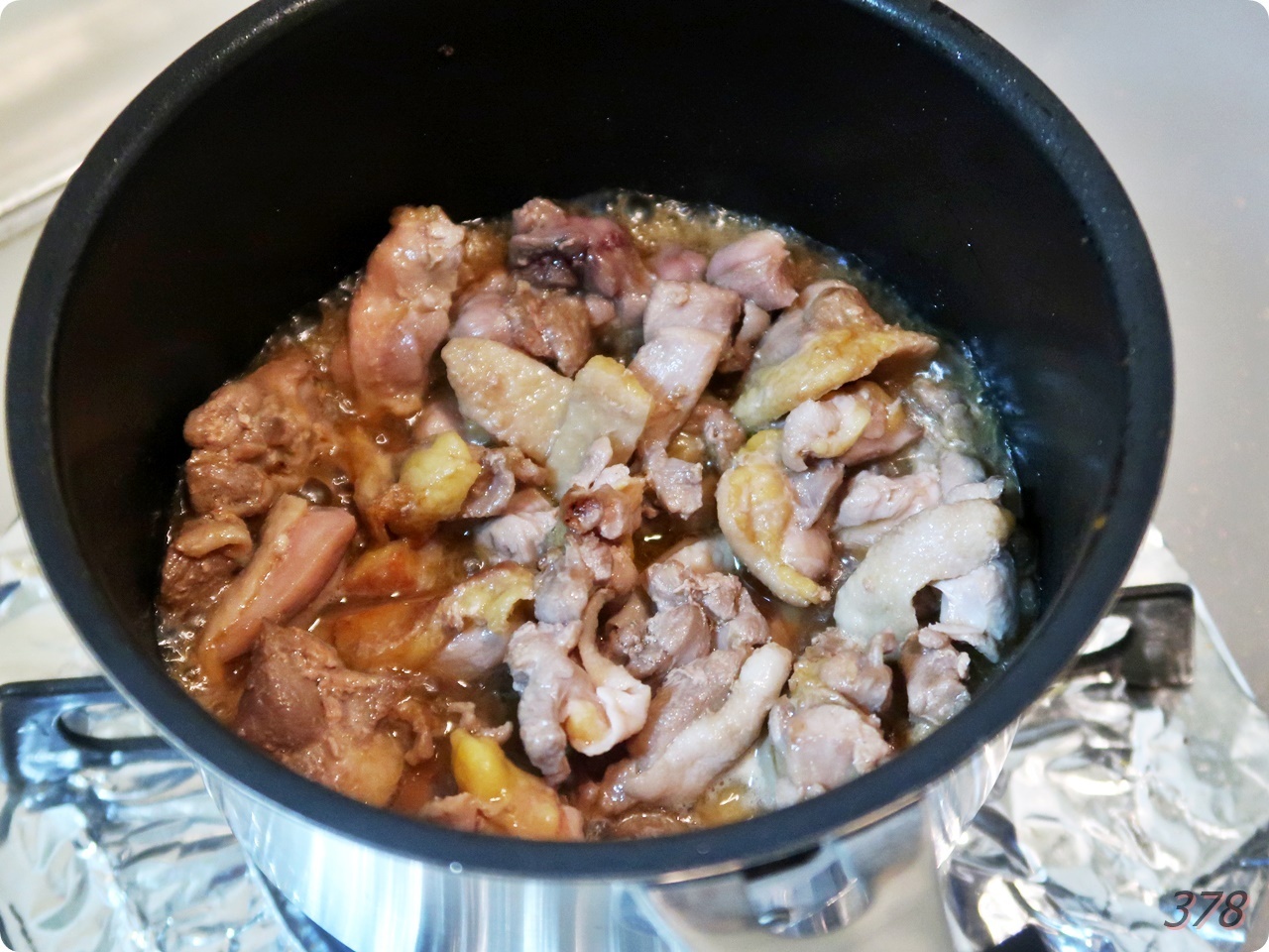 3. 味どうらくの里を大さじ2、やさしいお酢を大さじ3を入れ、弱火で15分ほど煮る。
